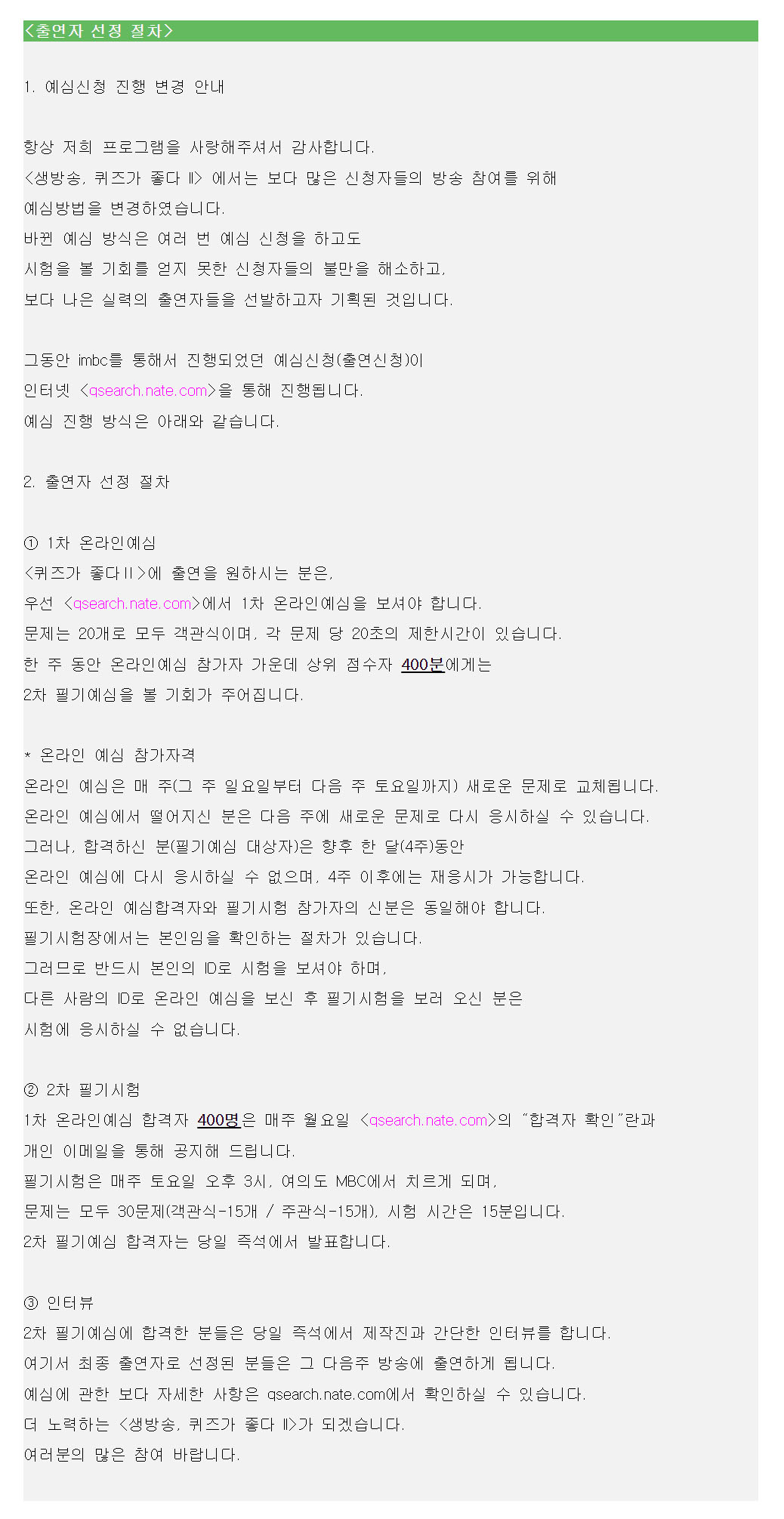 생방송 퀴즈가 좋다Ⅱ 출연자 선정 절차